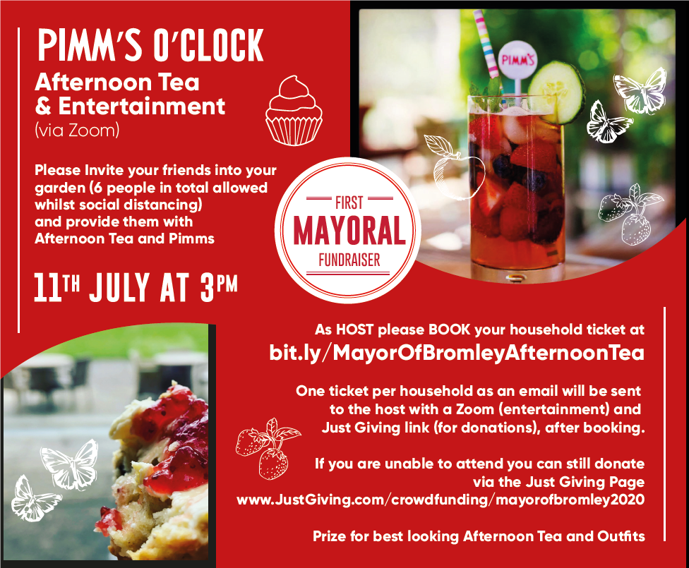 As the lockdown restrictions begin to ease, the Mayor invites you to host a group of up to six people, including yourself, in your garden for a socially distanced Pimms O'Clock Afternoon Tea on Saturday 11th July from 3.00pm.