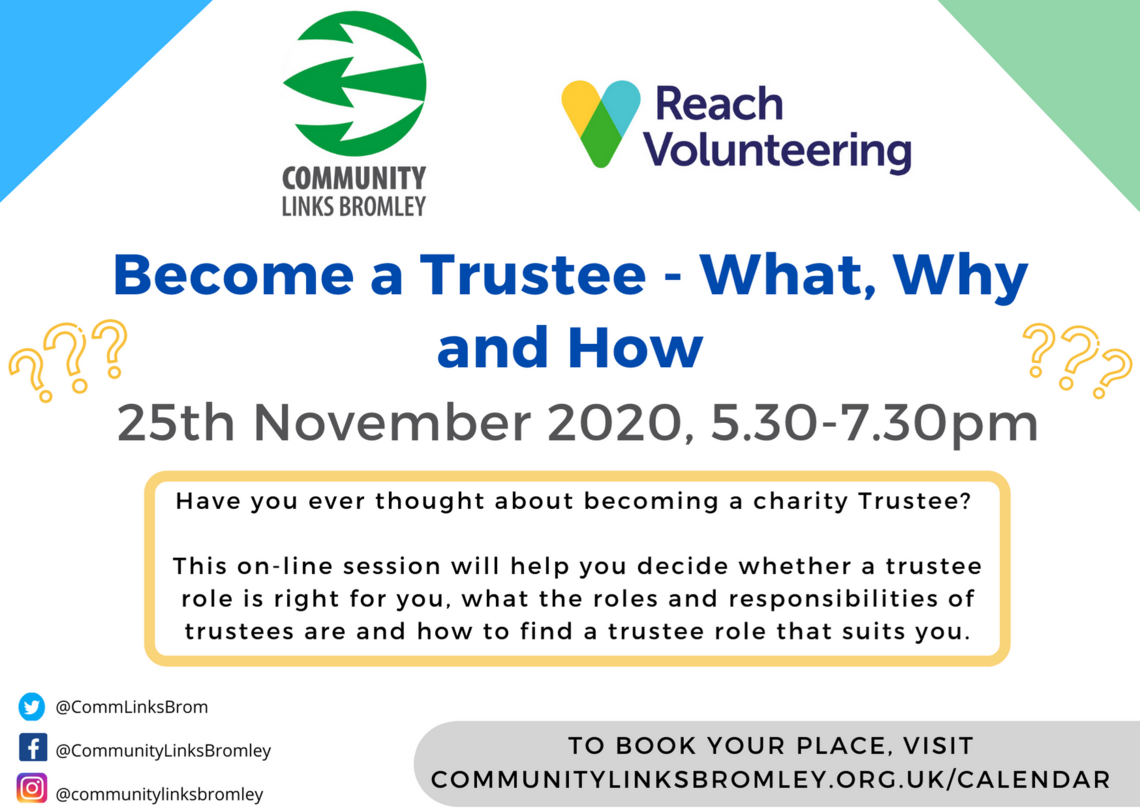 This on-line session will help you decide whether a trustee role is right for you, what the roles and responsibilities of trustees are and how to find a trustee role that suits you.