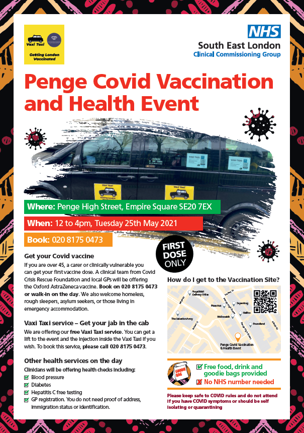 Get your jab in the cab. We are offering our free Vaxi Taxi service. You can get a lift to the event and the injection inside the Vaxi Taxi if you wish. To book this service, please call 020 8175 0473.