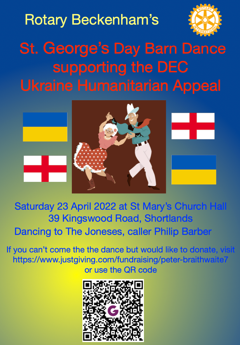 Rotary Beckenham is having a barn dance on St Georges Day, 23 April, to raise money for Ukrainian refugees. Places are limited so be quick, if you want to come. Contact Michele at michelebarndance@gmail.com.