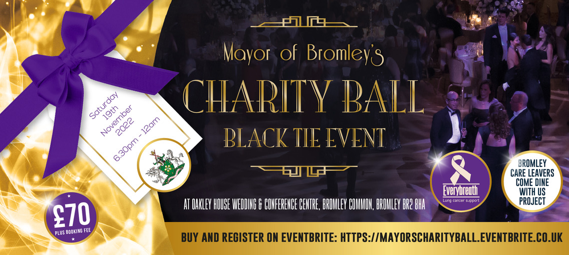 The Mayor of Bromley, Councillor Hannah Gray, is delighted to invite you to her Charity Appeal Ball on Saturday 19th November 2022 at Oakley House, Bromley Common, Bromley BR2 8HA. The evening will commence with a Drinks Reception at 6:30pm, followed by a three course meal.