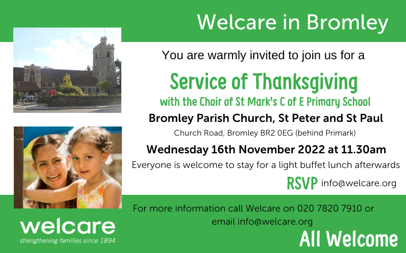 Join our colleagues from Welcare in Bromley on the Service of Thanksgiving for the work of the charity with children and families in the borough of Bromley. The service is open to everyone.