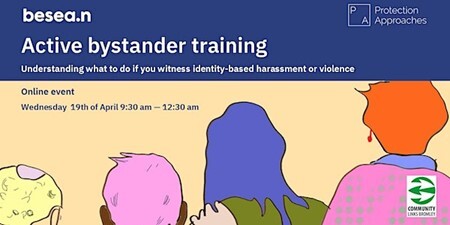 We are all aware of the recent shocking incidents of identity based harms that have taken place in our communities. Community Links Bromley is therefore delighted to be able to host a free 2 hours interactive online course on Active Bystander training. This will help participants understand what to do if you witness identity-based harassment or violence in your own spaces and communities. The expert training is being delivered by identity-based violence prevention charity, Protection Approaches, and has been developed in partnership with Britain’s East and Southeast Asian Network (besea.n).