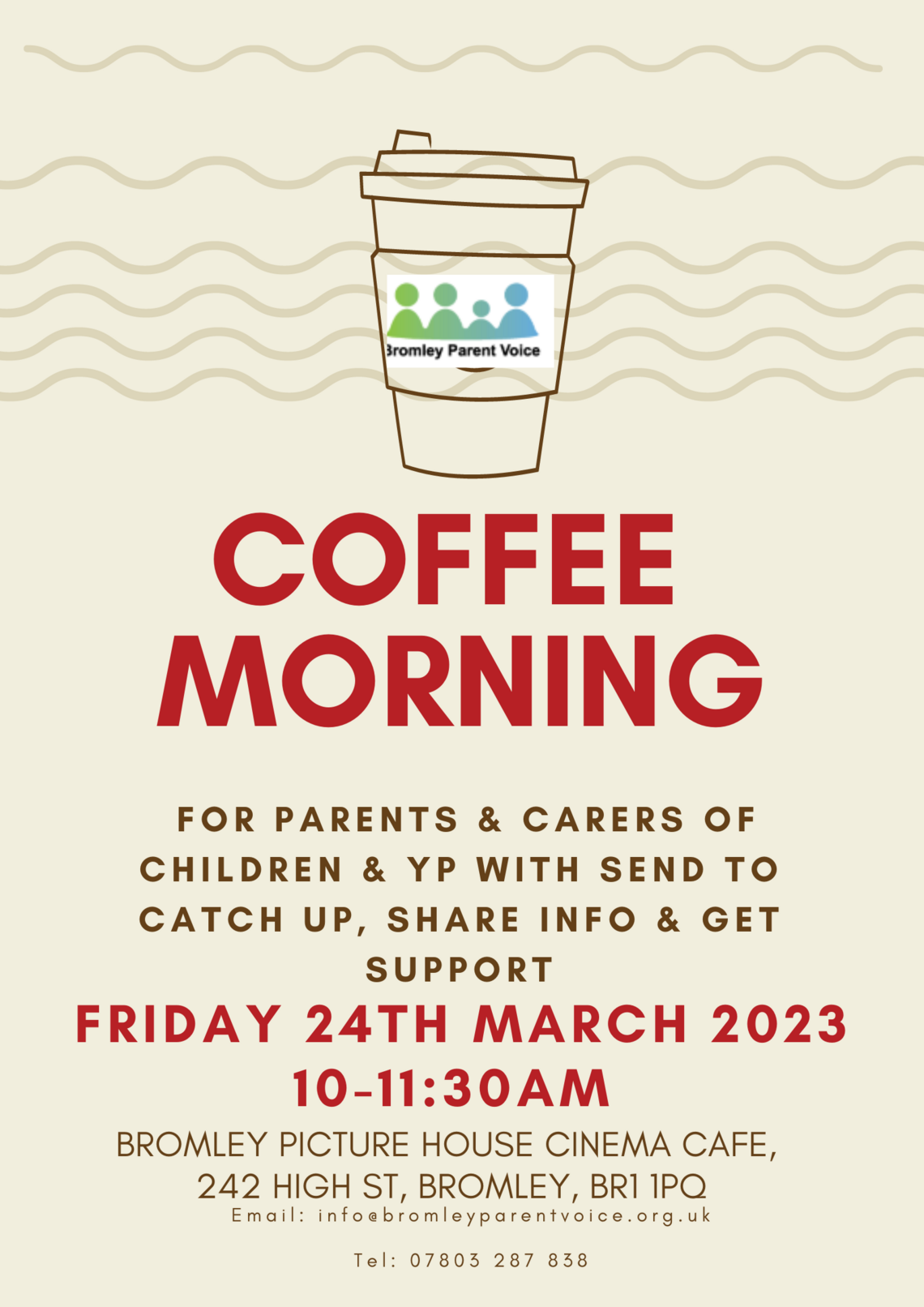 Join Bromley Parent Voice's coffee morning for parent & carers of children and young people with SEND on Friday 24th March, 10-11:30am at the Bromley Picture House Cinema Cafe.