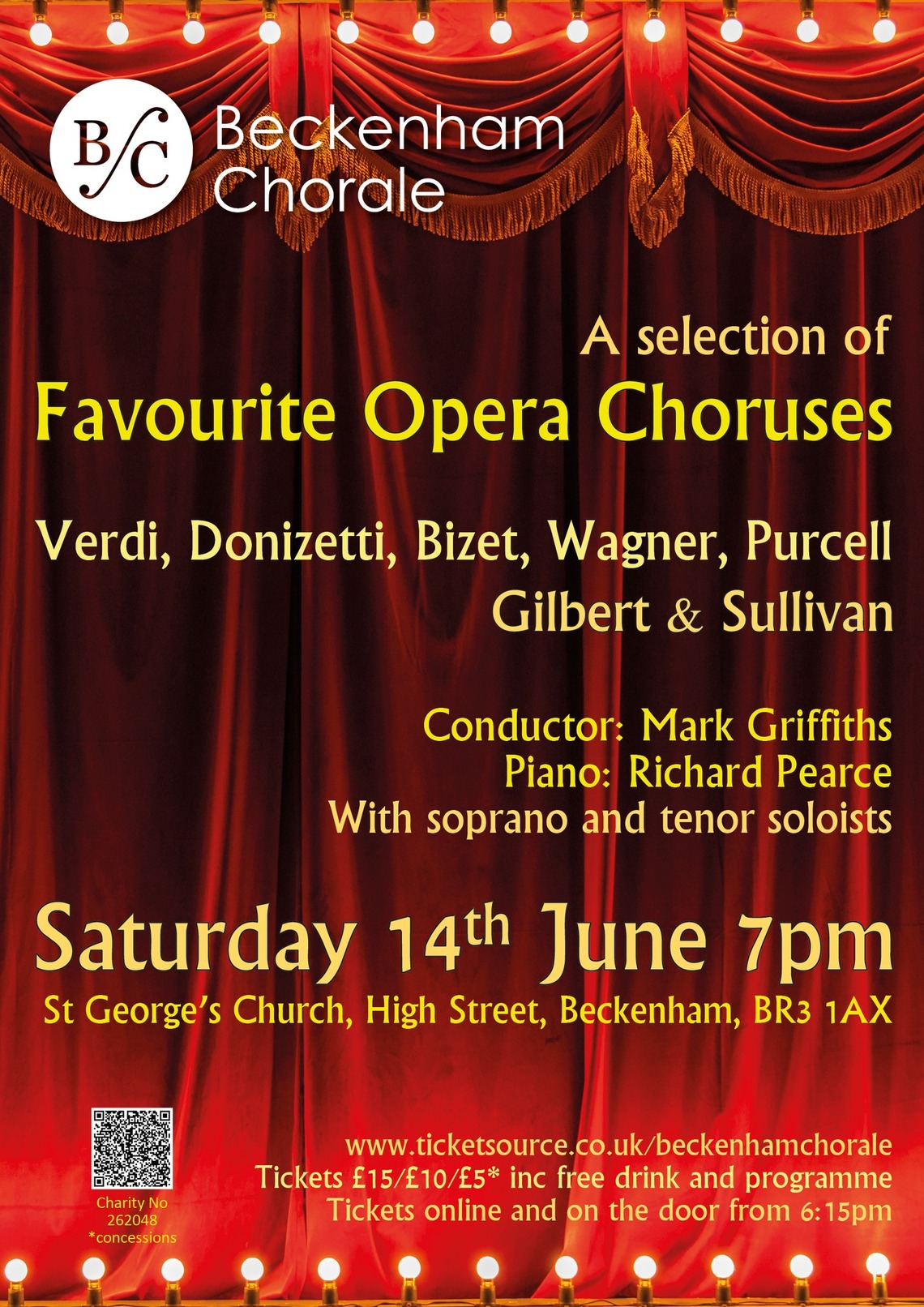 Join Beckenham Chorale for a summer treat as we journey throughout the opera and operetta world, visiting Paris, Babylon, Seville, the Duchy of Lotharingia, Scotland, Carthage, Imperial China and a village in Calabria on our Grand Tour. In a lighter vein, we travel with Gilbert & Sullivan from Cornwall through the English countryside and up to London via Venice!