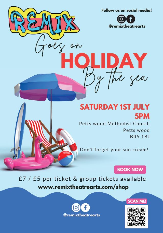 REMIX Theatre would like to invite you and your friends and family to our Summer show, REMIX goes on Holiday by the Sea. A comedy about going on holiday, and the trials and tribulations of the red coats and guests! A 45 minute show for the whole family in Petts wood.