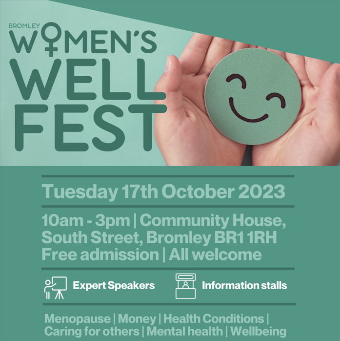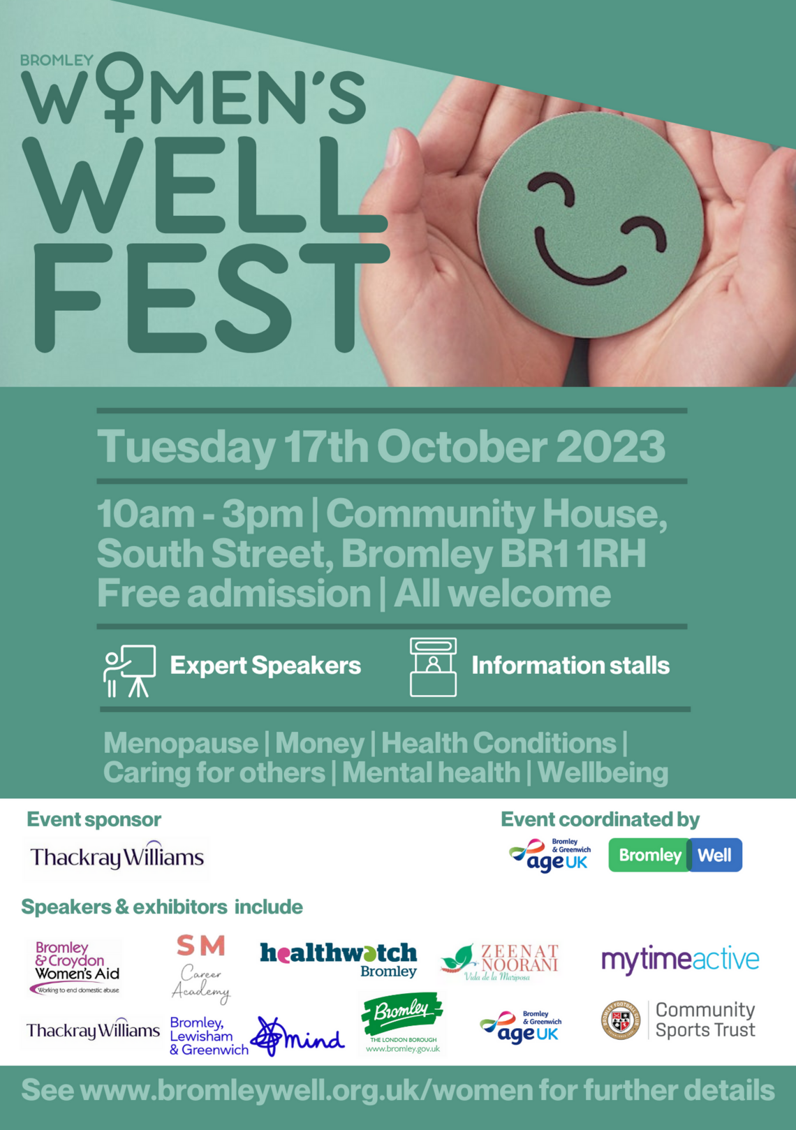 Age UK Bromley and Greenwich and Bromley Well are inviting Bromley residents to a free women's health and wellbeing day on Tuesday 17th October at Ground floor, Community House, South Street, Bromley, BR1 1RH.