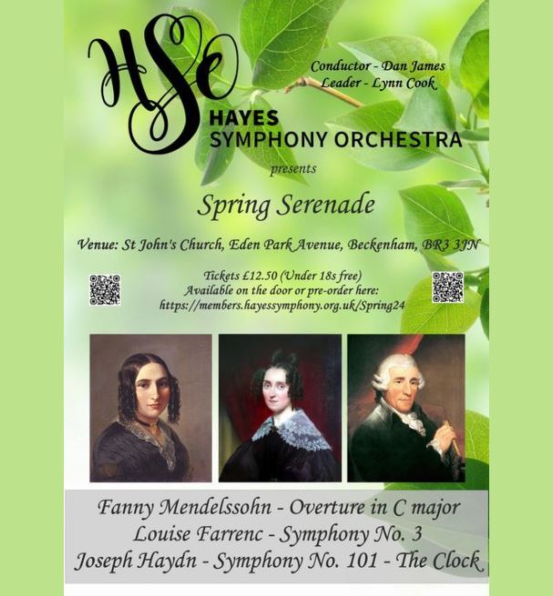 Join Hayes Symphony Orchestra on Saturday 16th March, 7:30pm for their next fabulous concert entitled 'Spring Serenade', celebrating the vibrant and exciting orchestral music of three remarkable composers, defined by their immense talent - Fanny Mendelssohn, Louise Farrenc and Joseph Haydn!