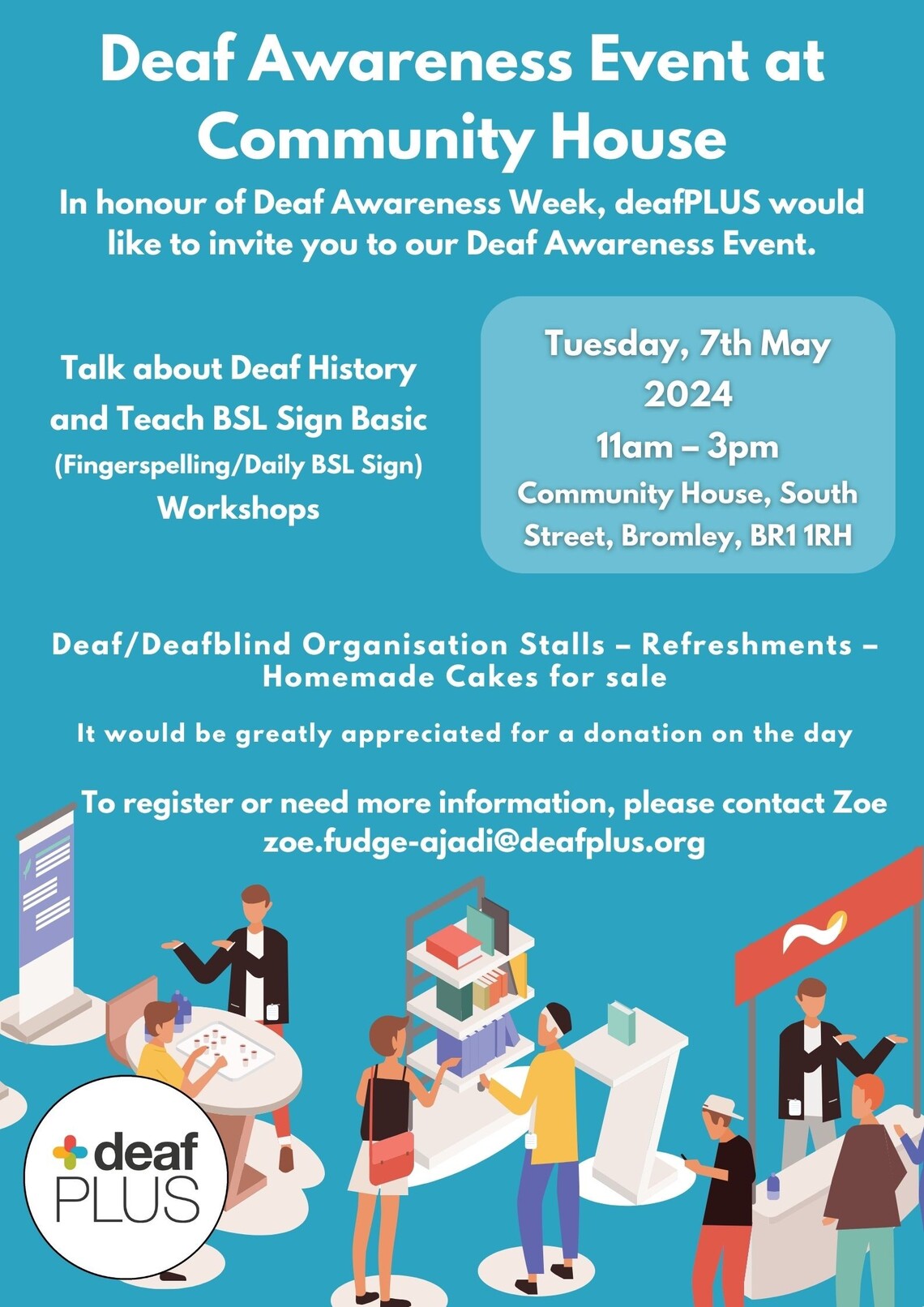 Deaf Plus would like to invite you to an event at Community House Bromley on 7th May 2024, in honour of Deaf Awareness Week. This event is aimed at professionals who work with the Deaf community and who have experienced difficulty providing services which meet their needs.