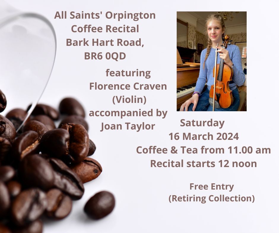 Florence Craven will be playing at All Saints Church’s free Coffee Recital on 16th March 2024. Tea and Coffee will be served from 11.00 am and the Recital starts at 12 noon. There is a retiring collection.