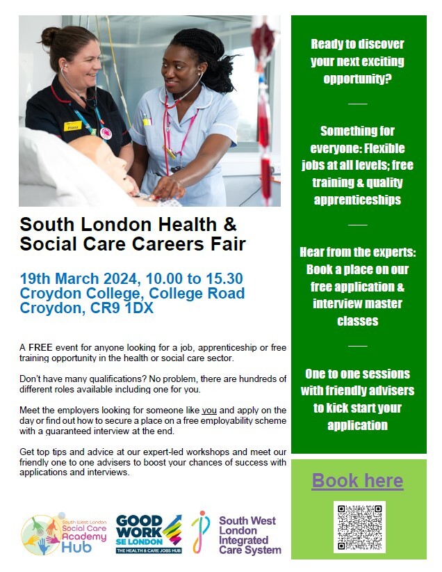 Join this FREE event for anyone looking for a job, apprenticeship or free training opportunity in the health or social care sector on 19th March 2024, 10.00 to 15.30 at Croydon College, College Road, Croydon, CR9 1DX.