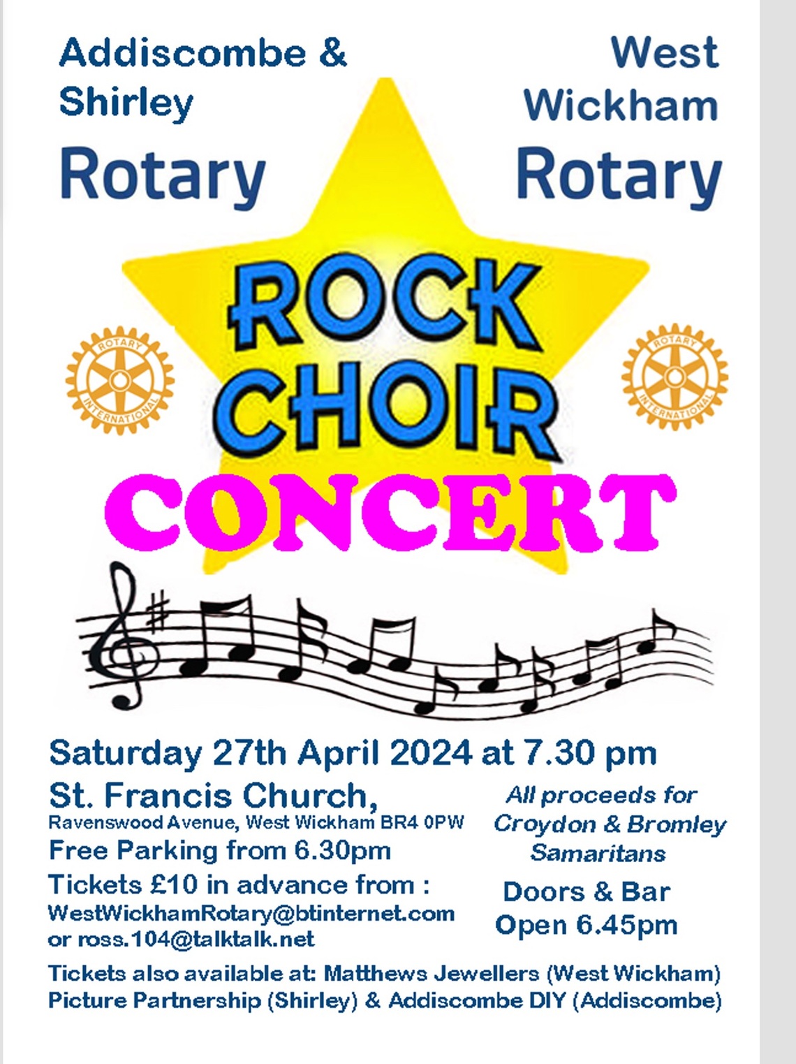 Join Rotary West Wickham for their next event which is a concert by the Rock Choir at St Francis Church in West Wickham on Saturday 27th April 2024.