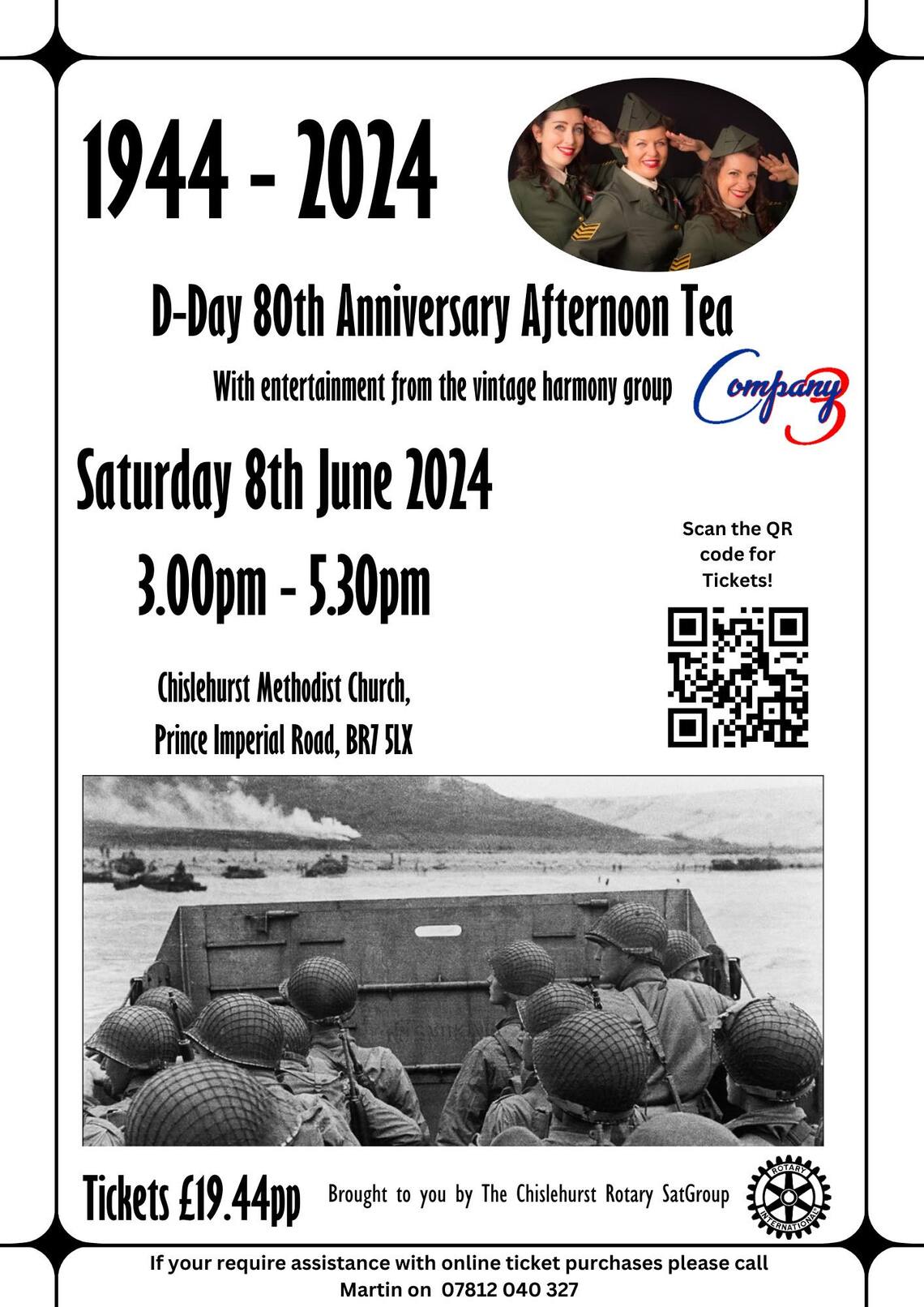 Join Chislehurst Rotary SatGroup on Saturday 8 June 3.00 – 5.30 pm for the D-Day 80th Anniversary Afternoon Tea. With entertainment of The Vintage Harmony Group