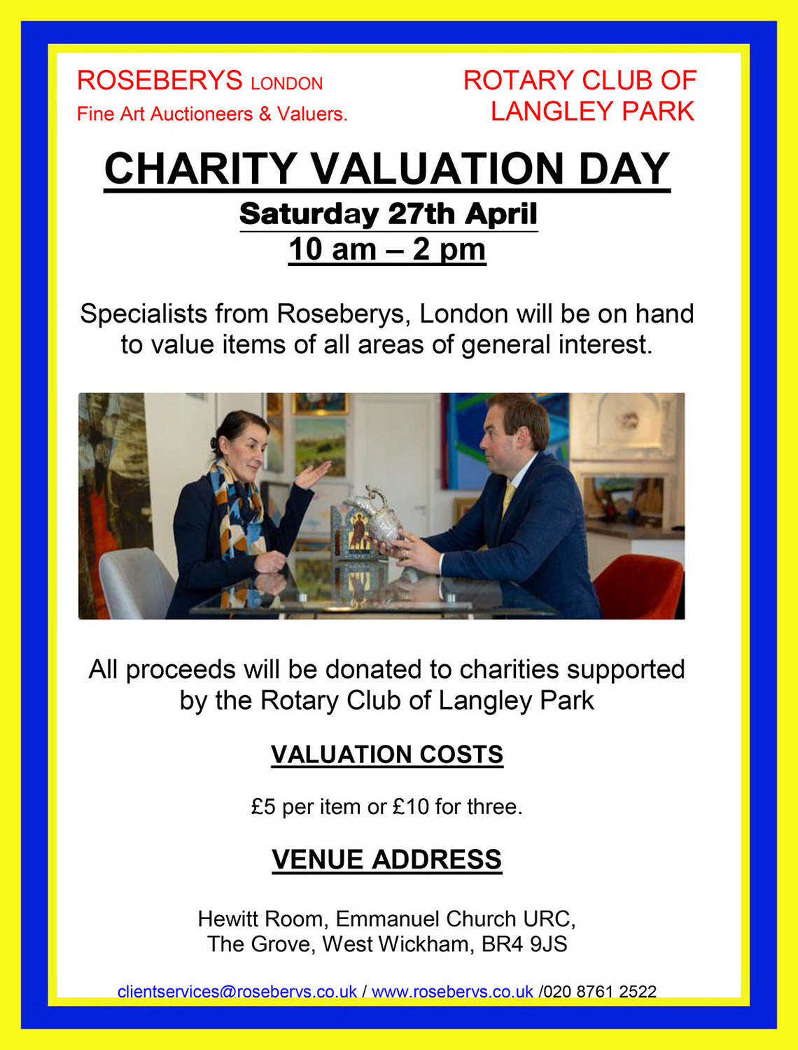 Specialists from Roseberys, London will be on hand to value items of all areas of general interest at this charity valuation day.