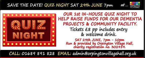 Orpington Village Hall Trust will be holding their first in-house quiz night to raise vital funds for their facility and Dementia projects. As a charitable organisation, the Trust depends on fundraising to continue to thrive and provide a space for the people of Orpington and surrounding areas.