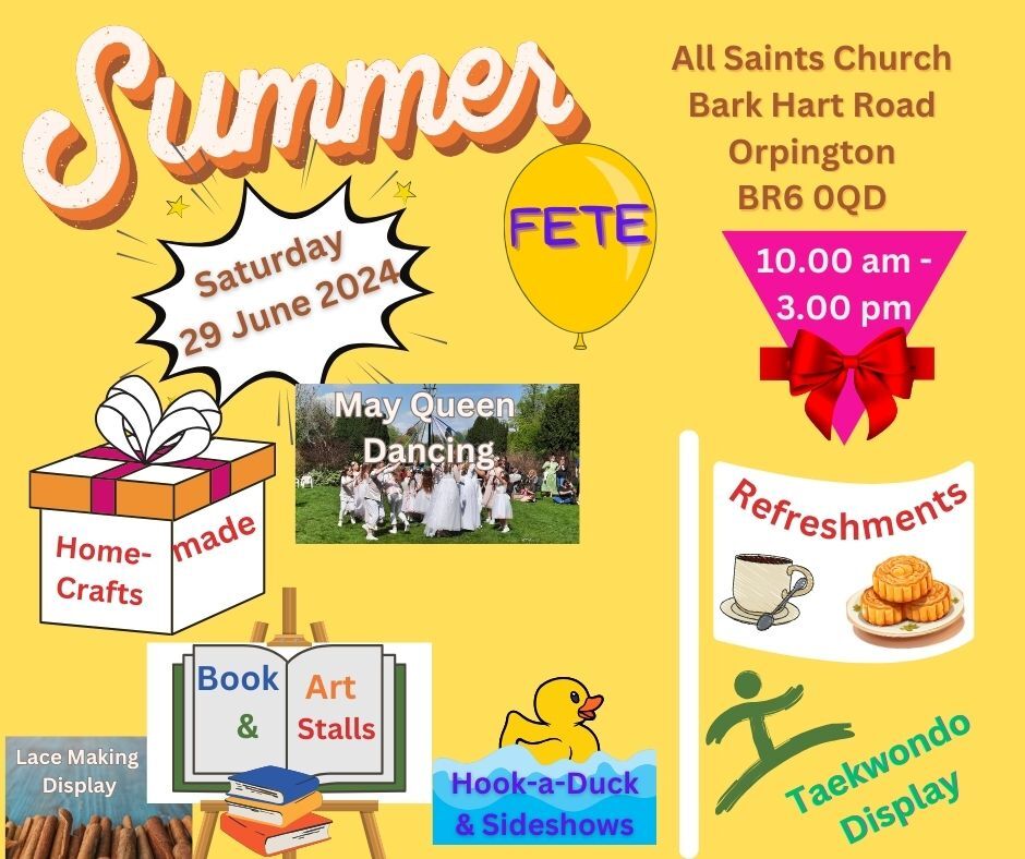 An exciting Summer Fete with displays from the Taekwondo Group and Orpington May Queen Dancing. Something for everyone, from side-shows such as Hoopla with the Guides, 'Hook-a-Duck' to having a go at lace-making! There will be home-made crafts just perfect for that unique present. Oh! Don't forget the yummy refreshments and all the other stalls! The event finishes at 3.00 pm so be sure not to miss it!