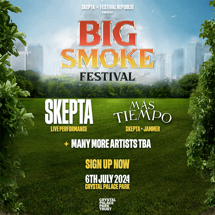 Skepta X Festival Republic presents Big Smoke Festival 2024. Taking place in Crystal Palace Park, Saturday, 6th July.