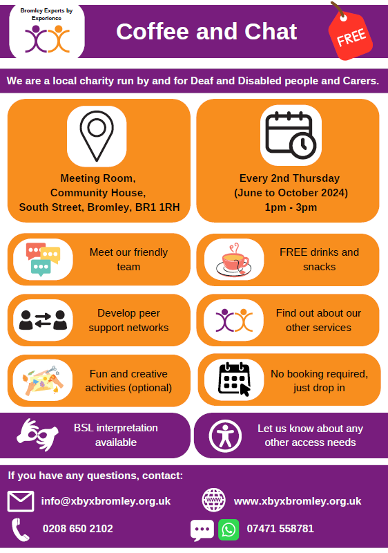 Join Bromley XbyX's friendly team to develop peer support networks, find out about their services and take part in fun and creative activities (if you want to). FREE drinks and snacks will be provided. No booking required, just drop in.