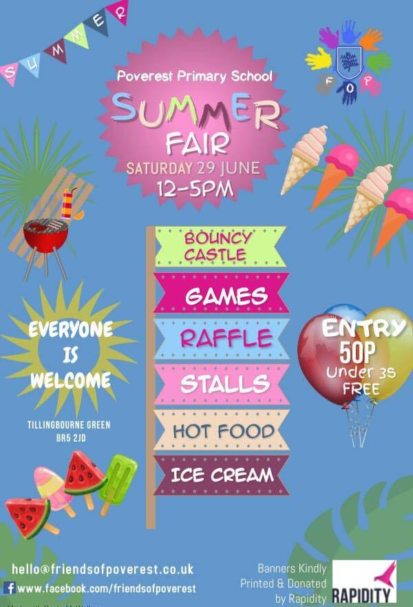 Poverest Primary School is having a Summer Fair on Saturday 29th June from 12-5pm. There will be bouncy castles, games, stalls, hot food, and ice cream.