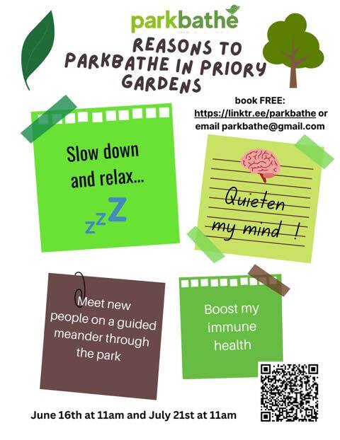 ParkBathe is a community-led free monthly well-being resource that is run in collaboration with the Friends of Priory Gardens in Orpington !