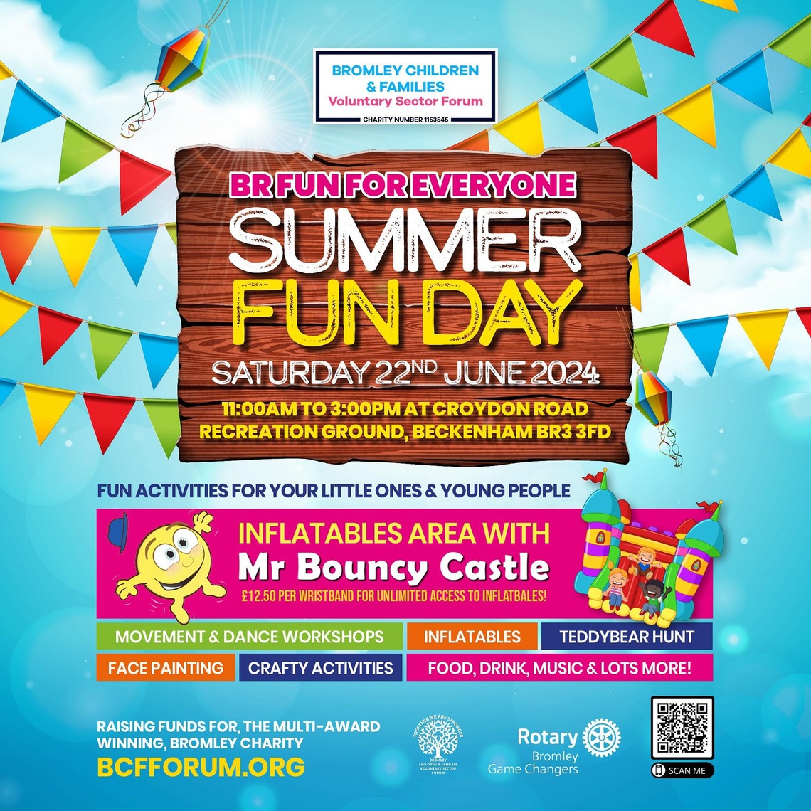 Summer Fun Day organised by the Bromley Children & Families Voluntary Sector Forum. It will be held on Saturday 22nd June 2024 from 11:00AM to 3:00PM at Croydon Road Recreation Ground, Beckenham BR3 3FD.