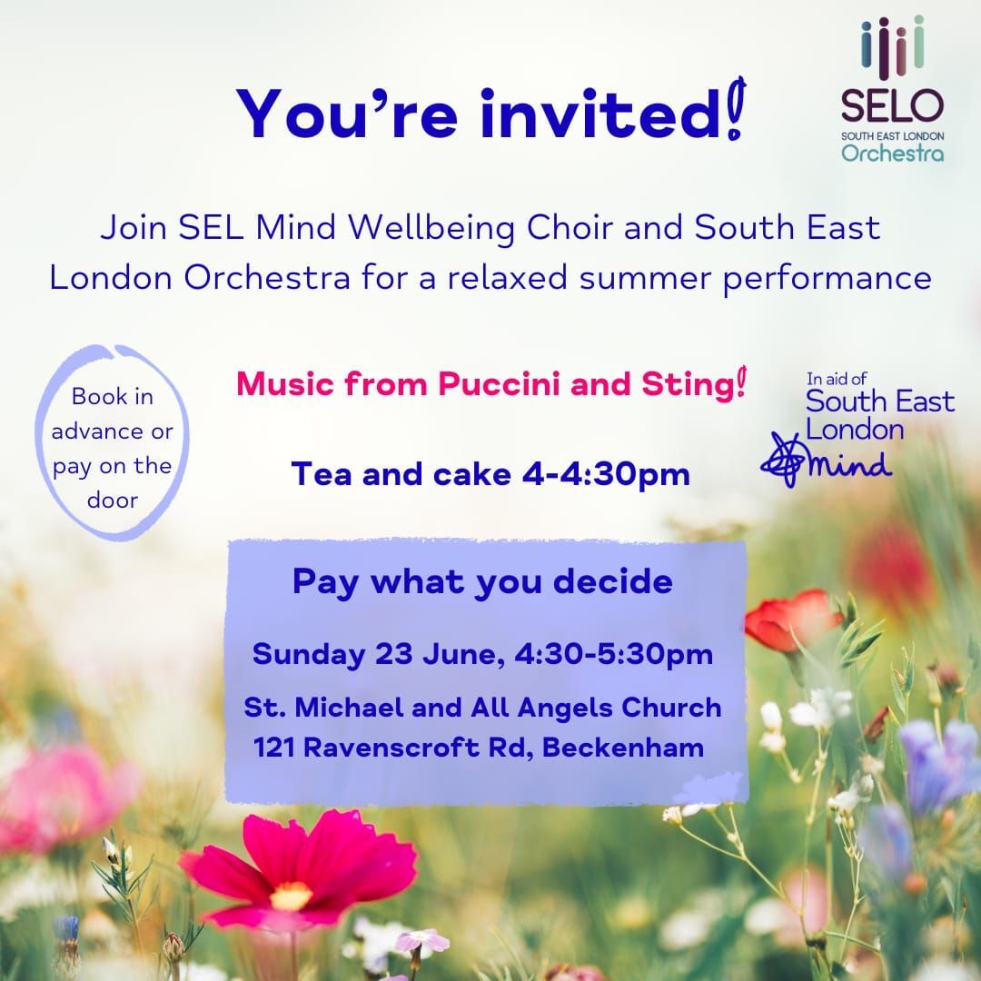 Don’t miss out South East London Orchestra second relaxed concert in partnership with South East London Mind and their Wellbeing Choir. This is an opportunity to see the orchestra perform in an informal atmosphere.