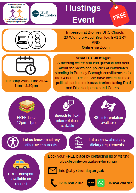 This event will focus on barriers Deaf and Disabled people face in Bromley and you will have the opportunity to question and hear about the views and policies of local candidates standing in the General Election.