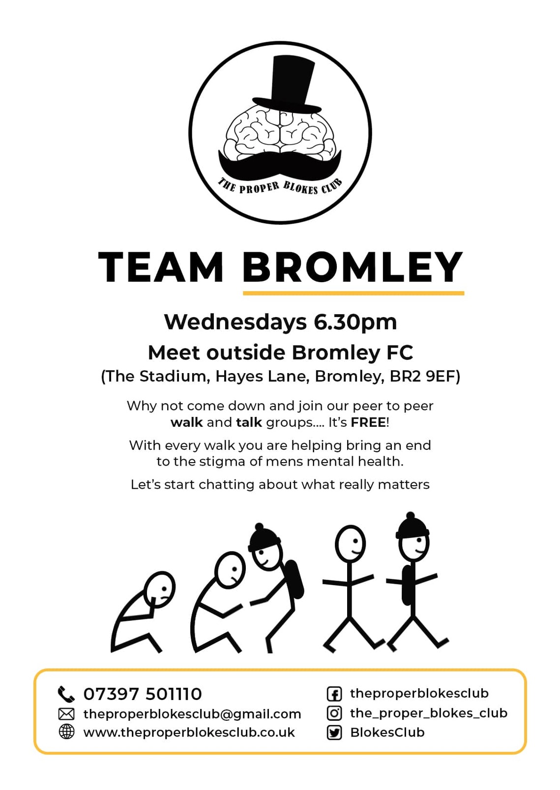 Join them on free walks every Wednesday at 6:30 PM, meeting outside of Bromley FC. The goal of the group is to help end the stigma surrounding men’s mental health by encouraging men to chat about what matters to them.
