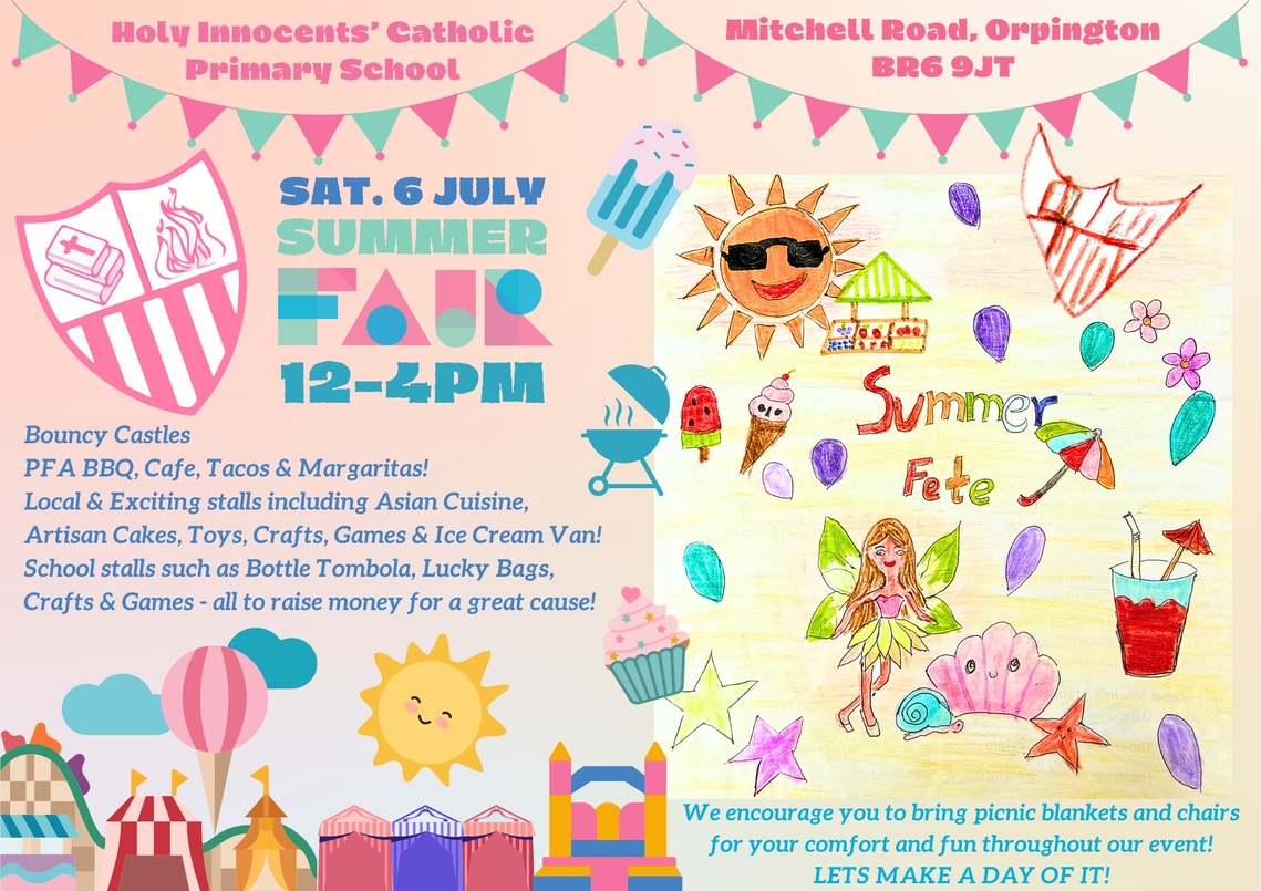 Holy Innocents’ Summer Fair!. The fair is Saturday 6th July between 12 and 4pm at Holy Innocents’ School, Mitchell Road, Orpington. This year there will be multiple bouncy castles for the kids, exciting food stalls featuring many cultural delights and bakes, Miffle Mix Pick n Mix, craft and toy stalls. The PFA grill, where you can grab a bargain burger or hotdog, an ice cream van and games for the kids (and the adults too)!