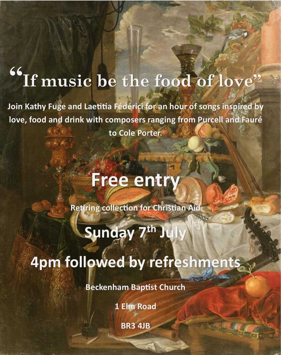 Pianist Laetitia Federici and soprano Katherine Fuge will perform songs by Purcell, Fauré, Cole Porter... on the theme of love, food and drink.