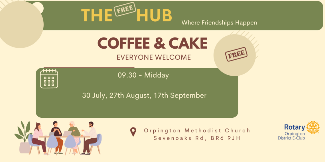Join Rotary Orpington District E-Club at their free monthly Warm Hub at the Orpington Methodist Church on the dates below. Lovely people, tasty cakes and more importantly building friendship and combating loneliness in Bromley.