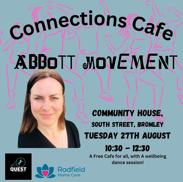 This month Connections Café have ‘Abbott Movement’ coming along to bring some well-being through dance. There will be dance moves that everyone can have a go at. They are really excited to welcome Ella from Abbott Dance for their August meetup.