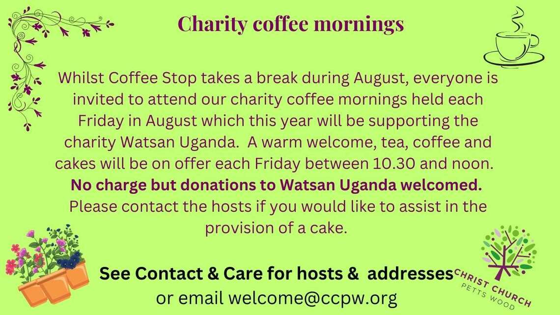 Whilst Coffee Stop takes a break during August, everyone is invited to attend our charity coffee mornings held each Friday in August which this year will be supporting the charity Watsan Uganda.