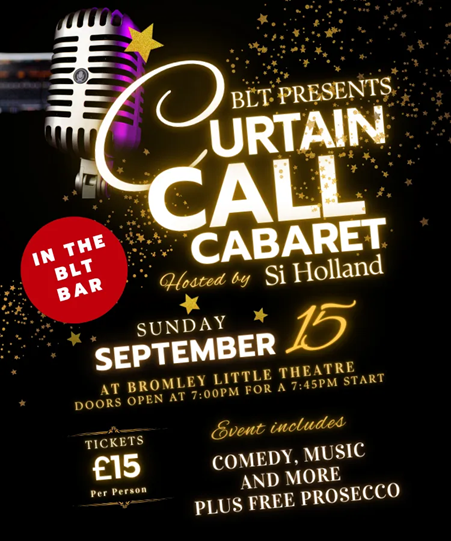 As part of Bromley Little Theatre's (BLT) season of fundraising activities, and to prepare the groundwork for the theatre’s glittering future, guests are invited to take a seat in their cabaret-style bar and indulge in an evening of comedy, music, fun and frivolity, showcasing the talents of BLT’s acting membership and invitees from Bromley’s creative community. Come one, come all… take your place at the Curtain Call.