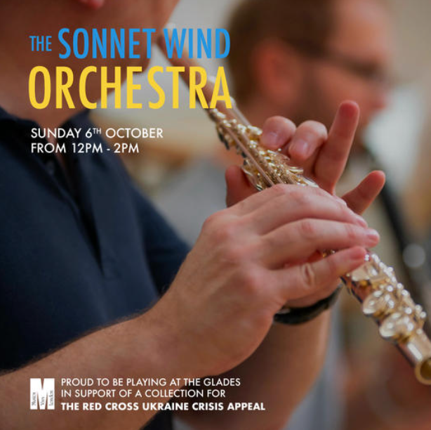 The Sonnet Wind Orchestra is proud to be playing in support of a collection for the Ukraine Crisis Appeal on Sunday 6th October, 12:30pm-2:30pm at The Glades, High St, Bromley BR1 1DN.