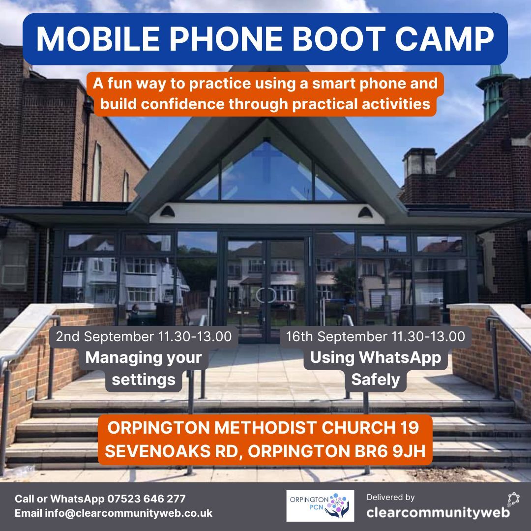 Mobile Phone Boot Camp - a fun way to practice using a smart phone for beginners or to build confidence, Using WhatsApp Safely and if you would like to know more!