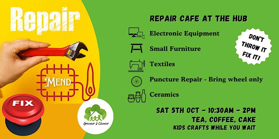 Welcome to the Repair Cafe at The Hub! Join Greener and Cleaner on Sat 5th Oct 2024 at 10:30 AM in The Hub, The Glades, Bromley for a fun and eco-friendly event. Bring your broken items and our skilled and experienced volunteers will help you fix them for free! Whether it's a wonky toaster, a wobbly chair or a moth holed jumper, they've got you covered. Let's reduce waste and learn new skills together. See you there!