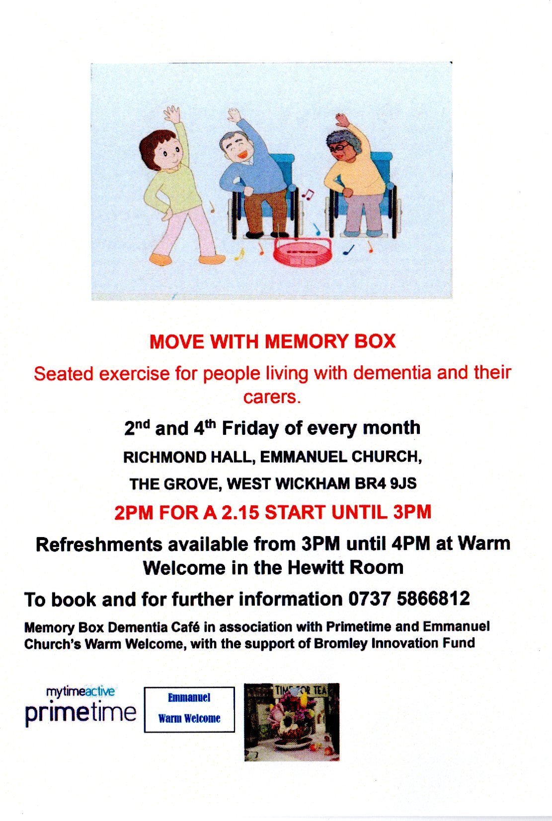 Join Memory Box and MytimeActive on the 2nd and 4th Friday of every month at Richmond Hall, Emmanuel Church, The Grove, West Wickham BR4 9JS. 2pm for a 2.15 start until 3pm.