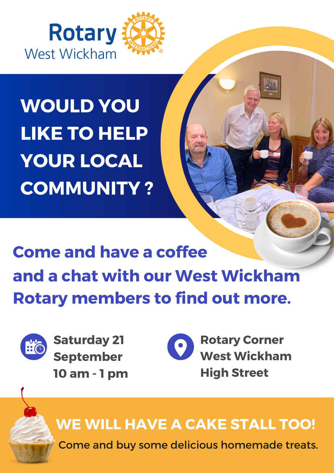 Join the West Wickham Rotary members for a coffee and a chat to find out more on Saturday 21 September, 10.00am – 1.00 pm