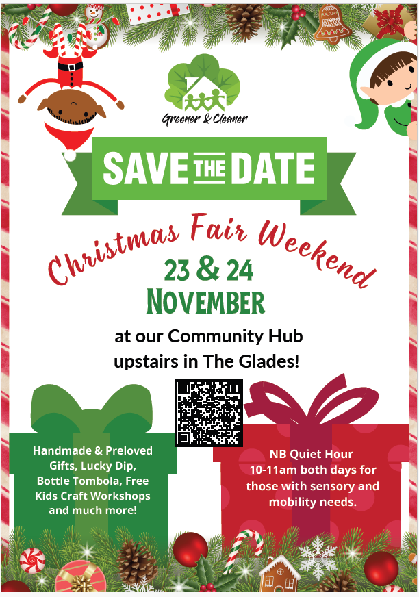 Come along to Greener & Cleaner's Christmas Fair Weekend on 23rd and 24th November at their Community Hub upstairs in The Glades.