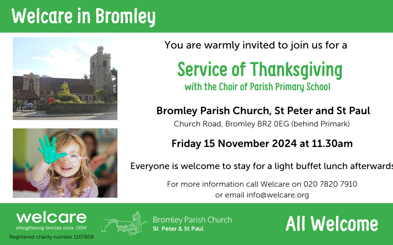 Join Welcare Bromley Annual Service of Thanksgiving for their work with children and families in the borough of Bromley which will take place on Friday 15 November, 11.30am, at Bromley Parish Church, St Peter and St Paul, Bromley, Church Road, Bromley, BR2 0EG.