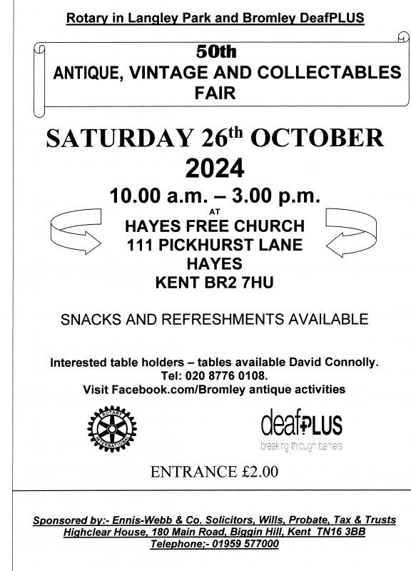 The 50th Antique, Vintage and Collectables Fair will be held on Saturday, October 26, 2024 from 10:00 AM to 3:00 PM at Hayes Free Church in Hayes, Kent. The event is organized by Rotary in Langley Park and Bromley DeafPLUS. Snacks and refreshments will be available. Entrance fee is £2.00. For more information or to rent a table, contact David Connolly at 020 8776 0108.