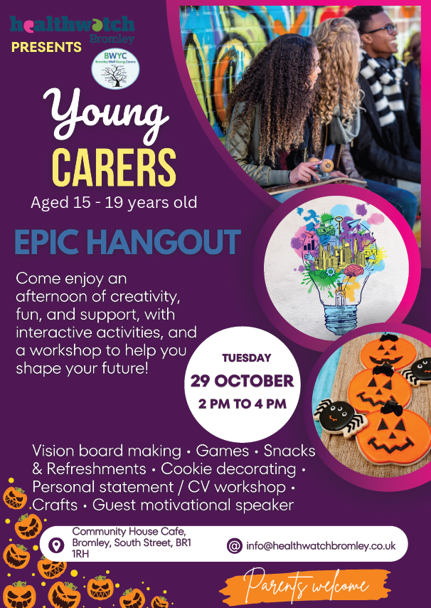 The event is targeted at young people aged 15-19 years old and will take place on Tuesday, October 29, 2024, from 2:00 PM to 4:00 PM at the Community House Cafe in Bromley.