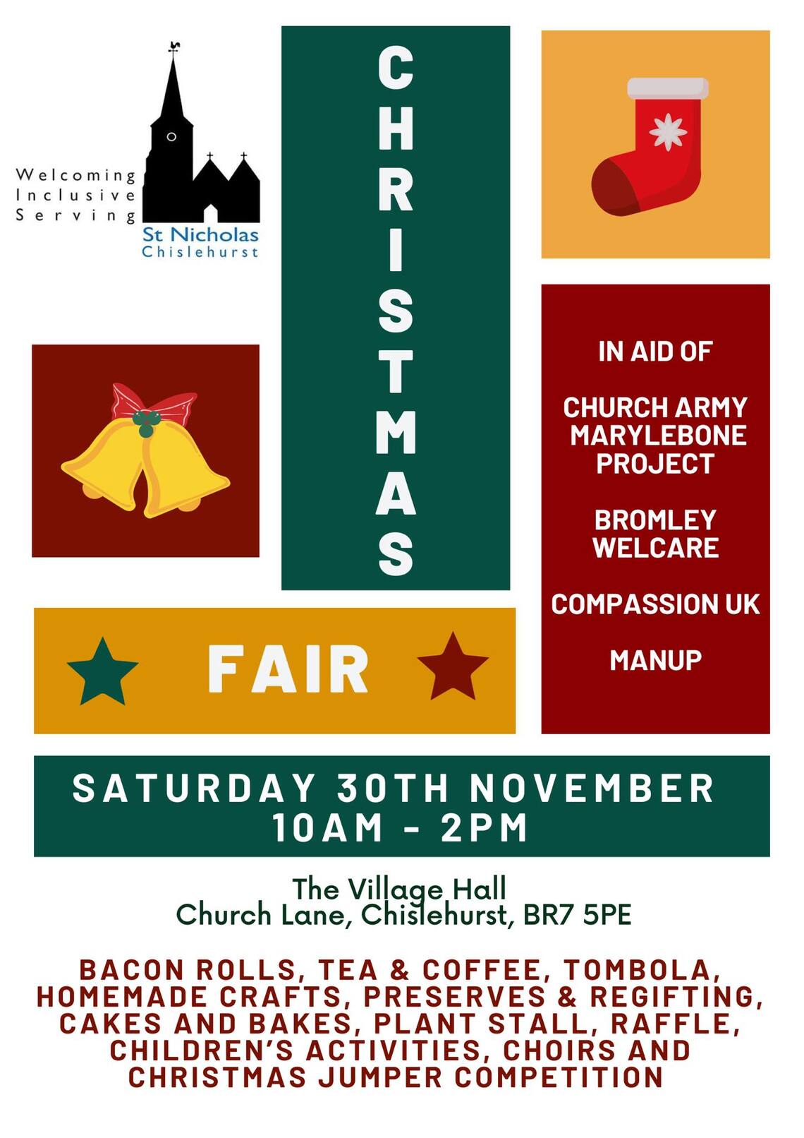 Join St Nicholas Church, Chislehurst, for their annual Christmas Fair, lots for all the family including free games and activities for children all money raised is donated to their chosen charities