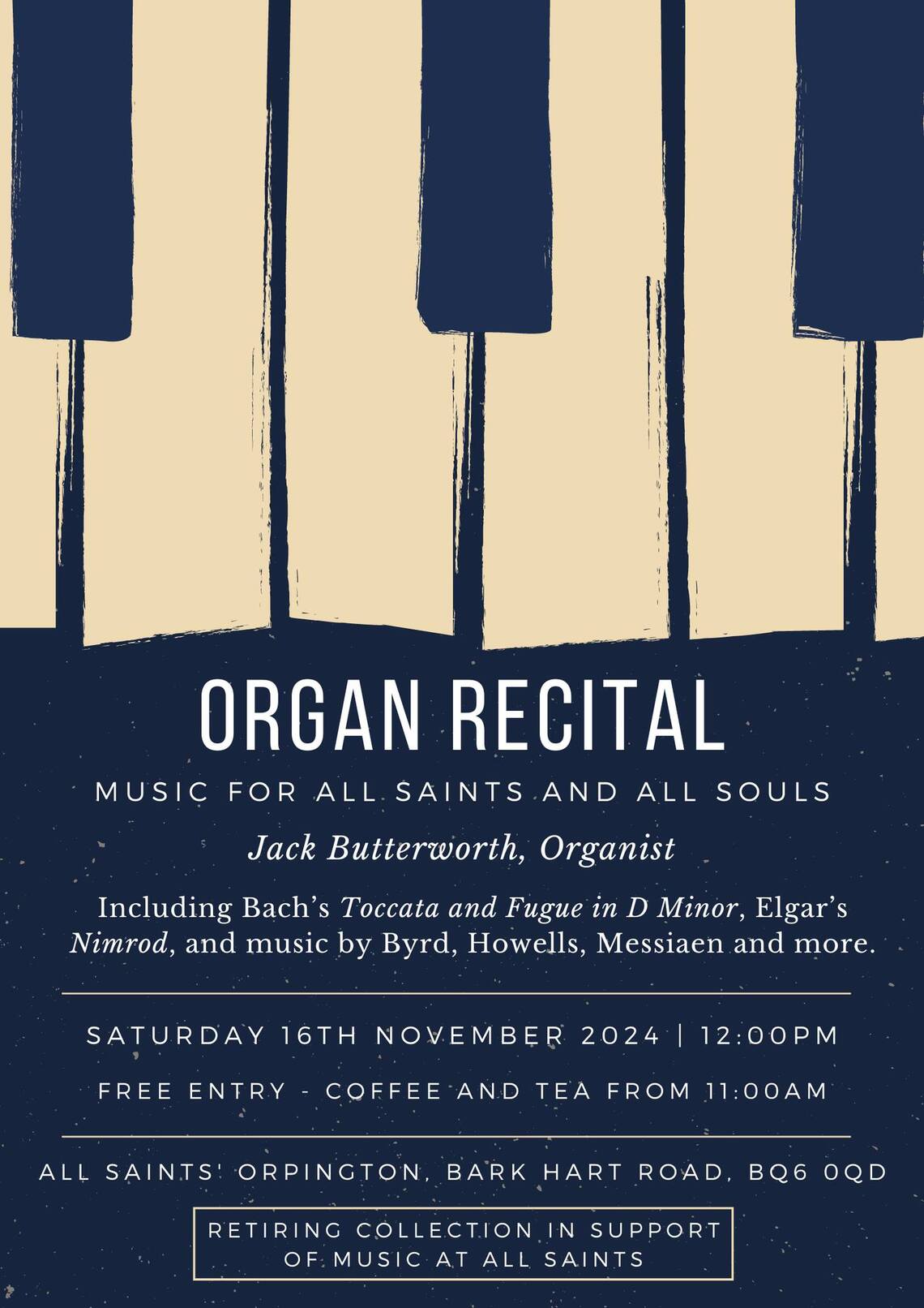 All Saints Orpington are delighted that Organist, Jack Butterworth, is going to give an organ recital on 16 November.