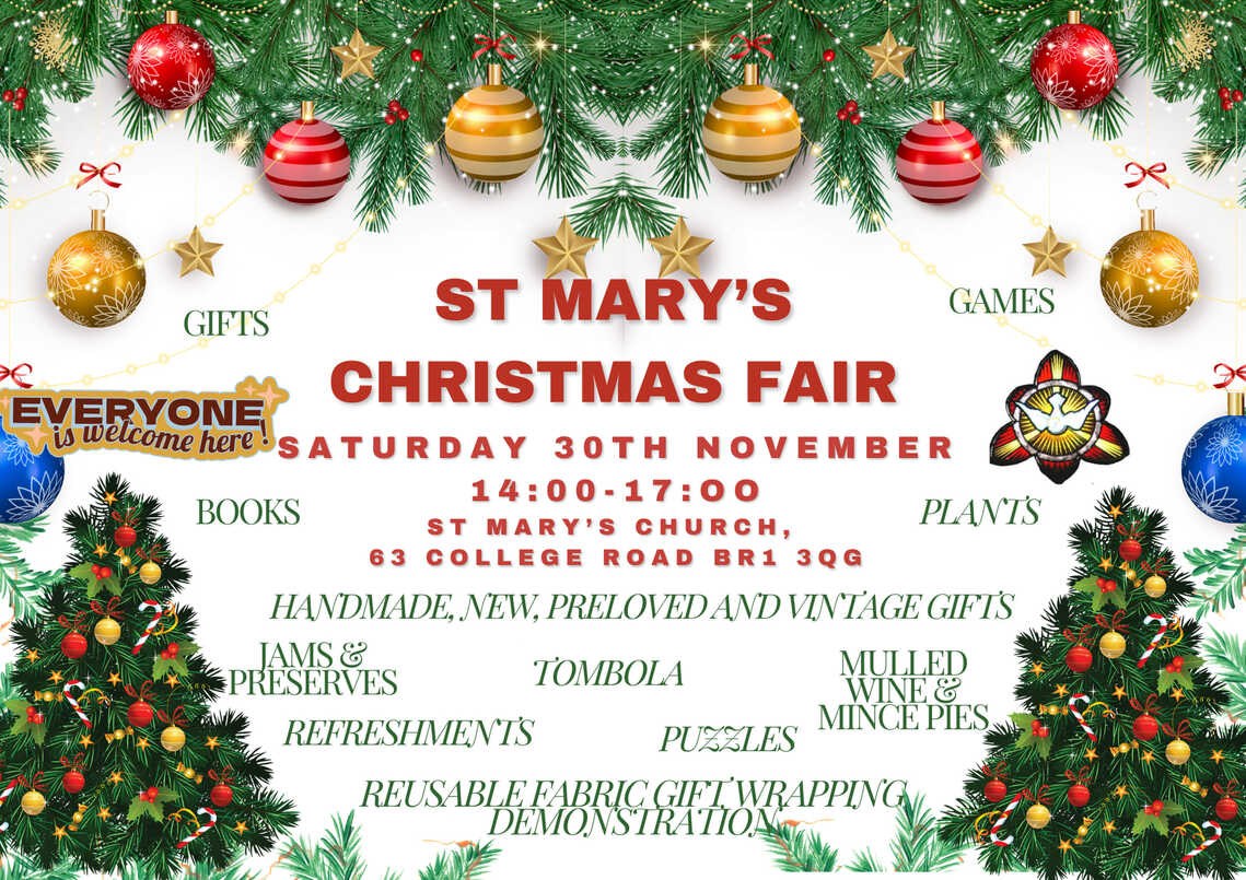 Don’t miss out St Mary's Christmas Fair on Saturday 30th November, 2.00 – 5.00pm at St Mary's Church, 63 College Road BR1 3QG. Everyone is welcome!