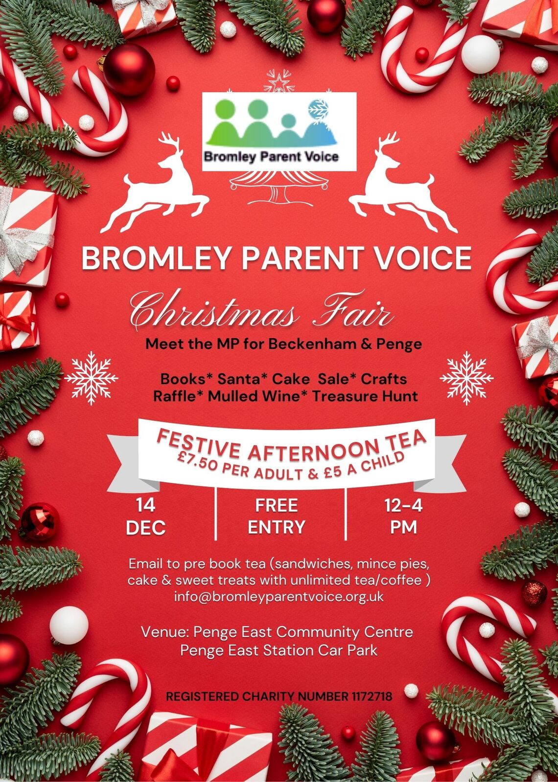 The MP for Penge East & Beckenham, Liam Conlon, will be attending to speak to carers of children with SEND. This is their first fundraising event for the whole community & theyhope to see many of you there. There will be Santa, a treasure trail, bubble show, crafts, cake stall and afternoon tea can be booked ahead to beat the queues.