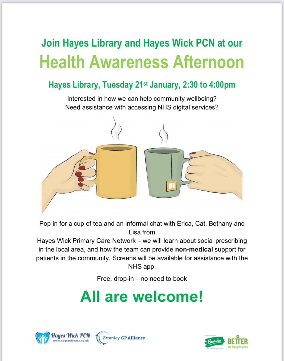 Please note: this event is not delivered by Community Links Bromley. Contact Hayes Wick Primary Care Network (PCN) for further information on the event