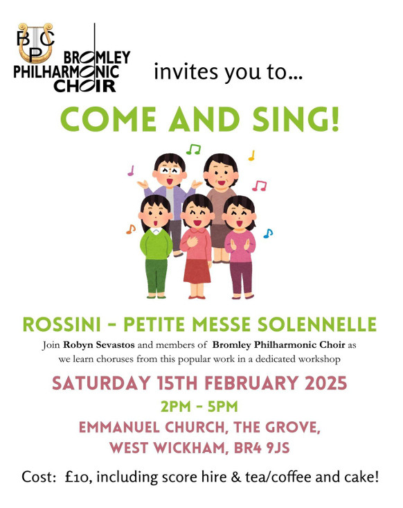 Join Bromley Philharmonic Choir on Saturday 15th February, 2.00 pm at Emmanuel United Reform Church, The Grove., West Wickham, BR4 9JS