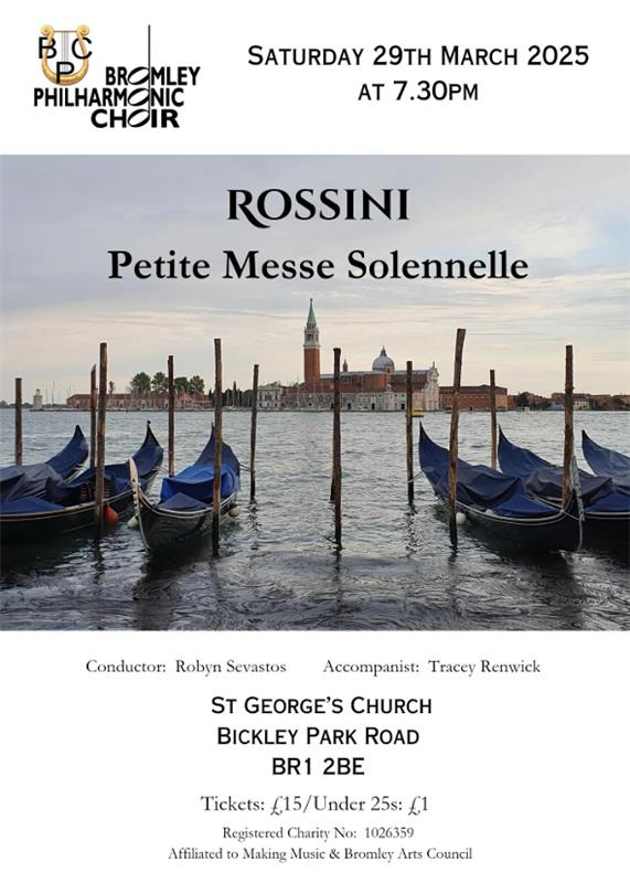 Join Bromley Philharmonic Choir on Saturday 29th March, 7.30pm at St. George's, Bickley Park Road, Bickley, Bromley, BR1 2BE for their Spring Concert, which features "Petite Messe Solonelle" by Gioachino Rossini.